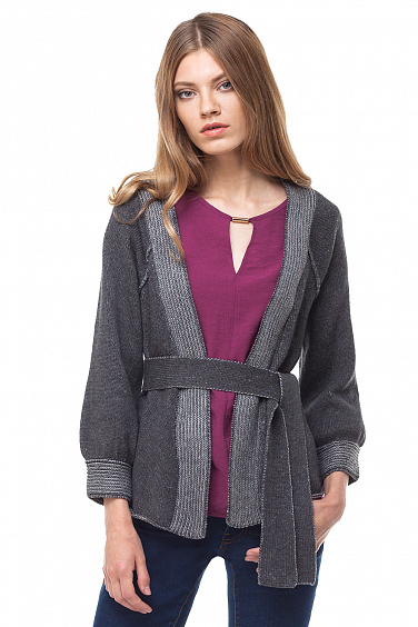 Вязанный жакет выполнен из плотной хлопковой пряжи с добавлением нейлона для придания изделию формоустойчивости. Модель дополнена объемными рукавами реглан и широким съемным поясом. Планки и манжеты выполнены фактурной двухцветной вязкой.