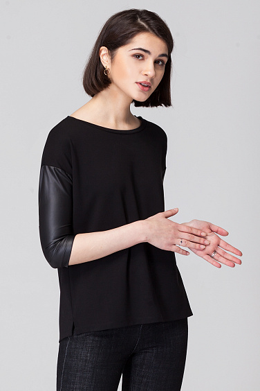 Джемпер выполнен из плотного эластичного трикотажа. Прямой силуэт с удлиненной спинкой, спущенный рукав выполнен из эластичного полотна "под кожу"