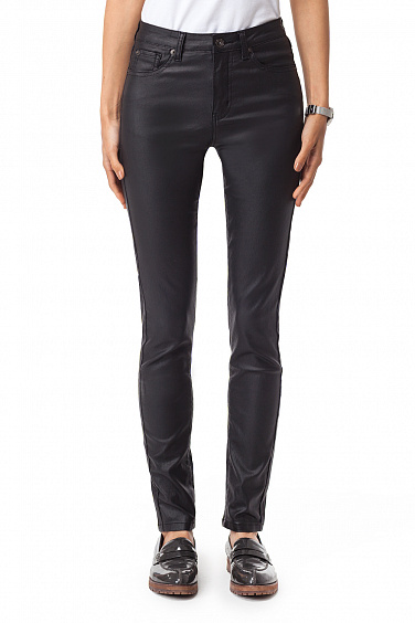 Брюки под "кожу" выполнены из очень эластичного хлопкового полотна. Изделие средней посадки с классическим джинсовым кроем с 5 карманами.