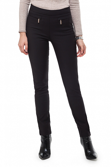 Брюки-скинни с завышенной талией выполнены из плотного, эластичного полотна. Застежка на молнию в боковом шве. Спереди имитация карманов с листочкой и декоративными молниями. Фурнитура золотистого цвета. Низ штанины дополнен разрезом.