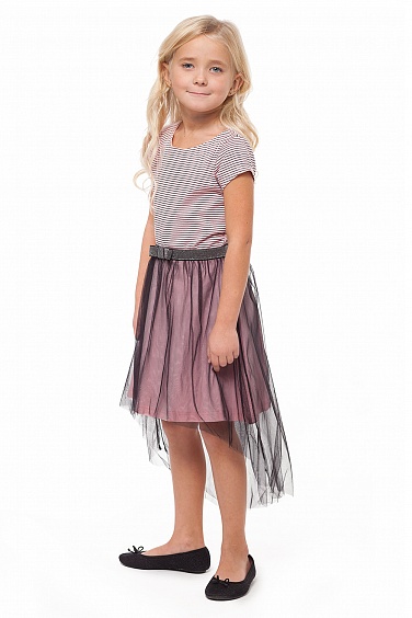 Платье с удлиненной линией спинки. Верх выполнен из хлопкового трикотажа. Низ платья из сетки контрастного цвета. Сзади имитация застежки на пуговицы. Талия декорирована поясом с бантом.