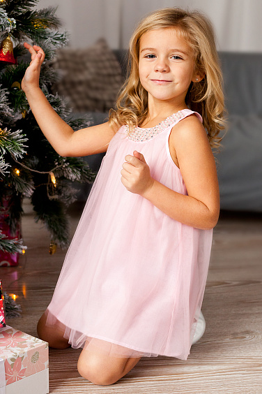 Платье А-силуэта на подкладке из хлопка. Спереди горловина украшена перламутровыми бусинами и прозрачными зеркальными стразами. Сзади застежка на декоративную пуговицу. Верхний слой платья выполнен из двойной тонкой сетки.