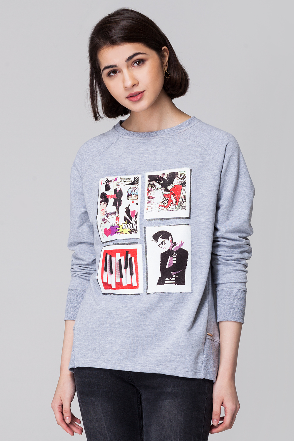 Хлопковый свитшот свободного покроя выполнен из футера. Спереди яркий принт в стиле винтажного комикса. Рукава-реглан, боковые швы со смещением. Манжеты, окантовка горловины и низ изделия из рибаны.