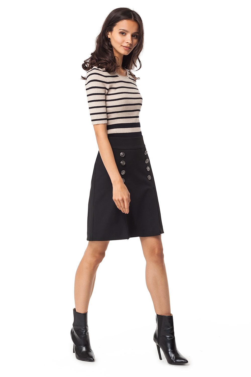 Облегающий джемпер связан из плотной эластичной хлопковой пряжи вязкой "резинка". Округлый вырез горловины, по бокам однотонные вставки основного цвета.