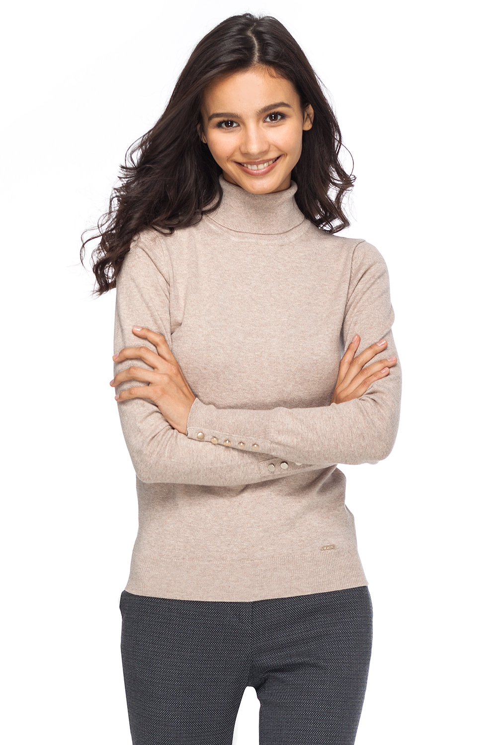 Однотонная трикотажная водолазка незаменимая вещь в каждом гардеробе. Изделие выполнено из хлопковой пряжи с добавлением нейлона для придания формоустойчивости изделию. Широкие манжеты украшены рядом серебристых пуговиц.