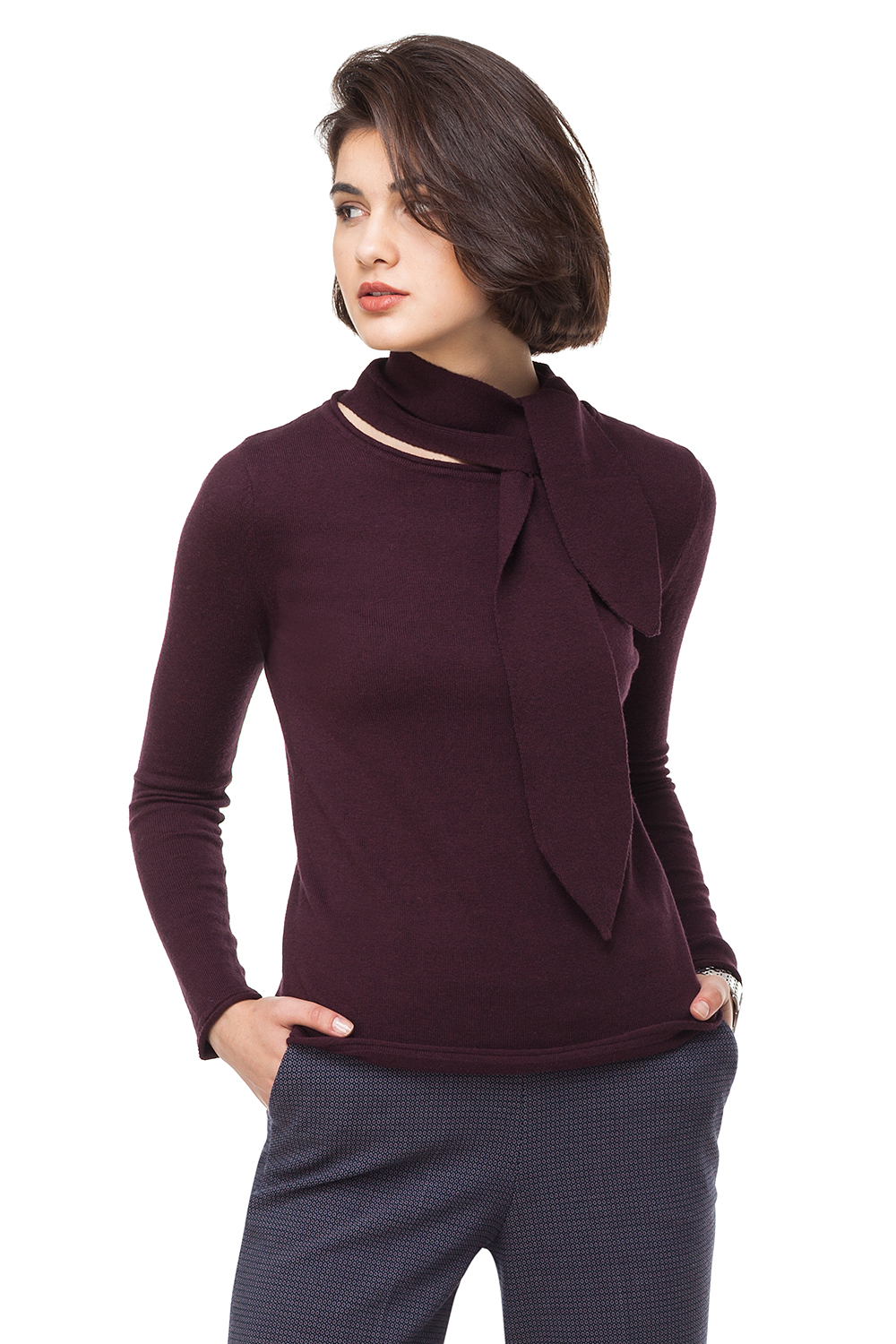 Джемпер выполнен из хлопковой пряжи с добавлением нейлона для придания изделию формоустойчивости. Классический силуэт изделия дополнен необработанными краями и съемным воротником-шарфом.