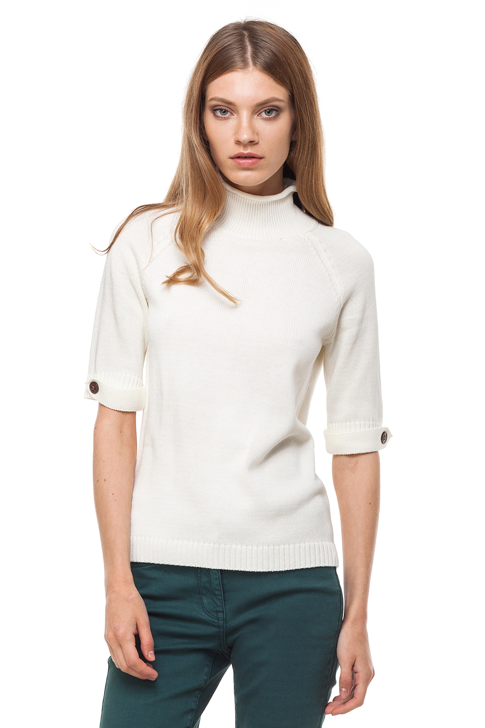 Вязанный свитер с укороченным рукавом реглан выполнен из мягкой хлопковой пряжи. Высокий воротник-стойка, укороченный рукав дополнены декоративным элементом.