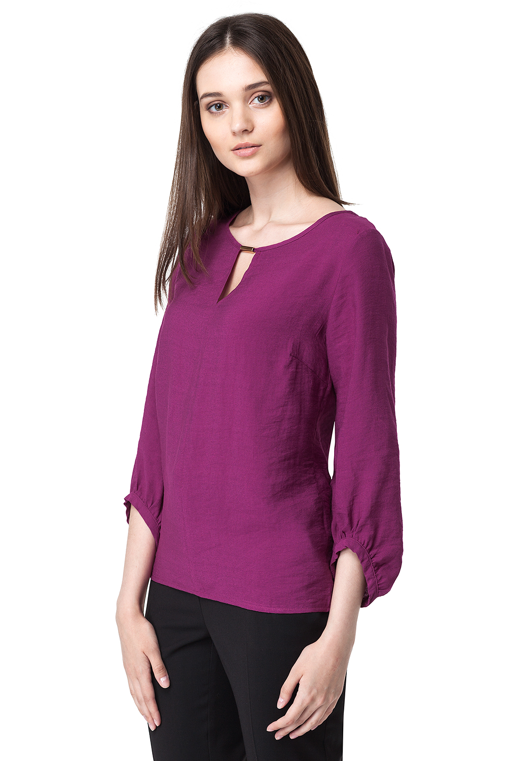 Блузка свободного силуэта выполнена из плотного вискозного полотна с легким эффектом жатки. Спереди V-образный вырез с металлическим декоративным элементом. Широкий укороченный рукав со сборкой на асимметричную манжету.