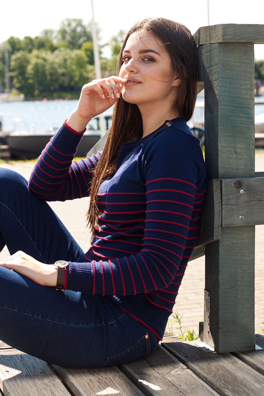 Джемпер выполнен из хлопковой пряжи с добавлением нейлона, для придания изделию формоустойчивости. Изделие с фактурной вязкой в контрастную полоску. На плечах изделие дополнено симметричными планками с застежкой на пуговицы. Идеальная базовая вещь.