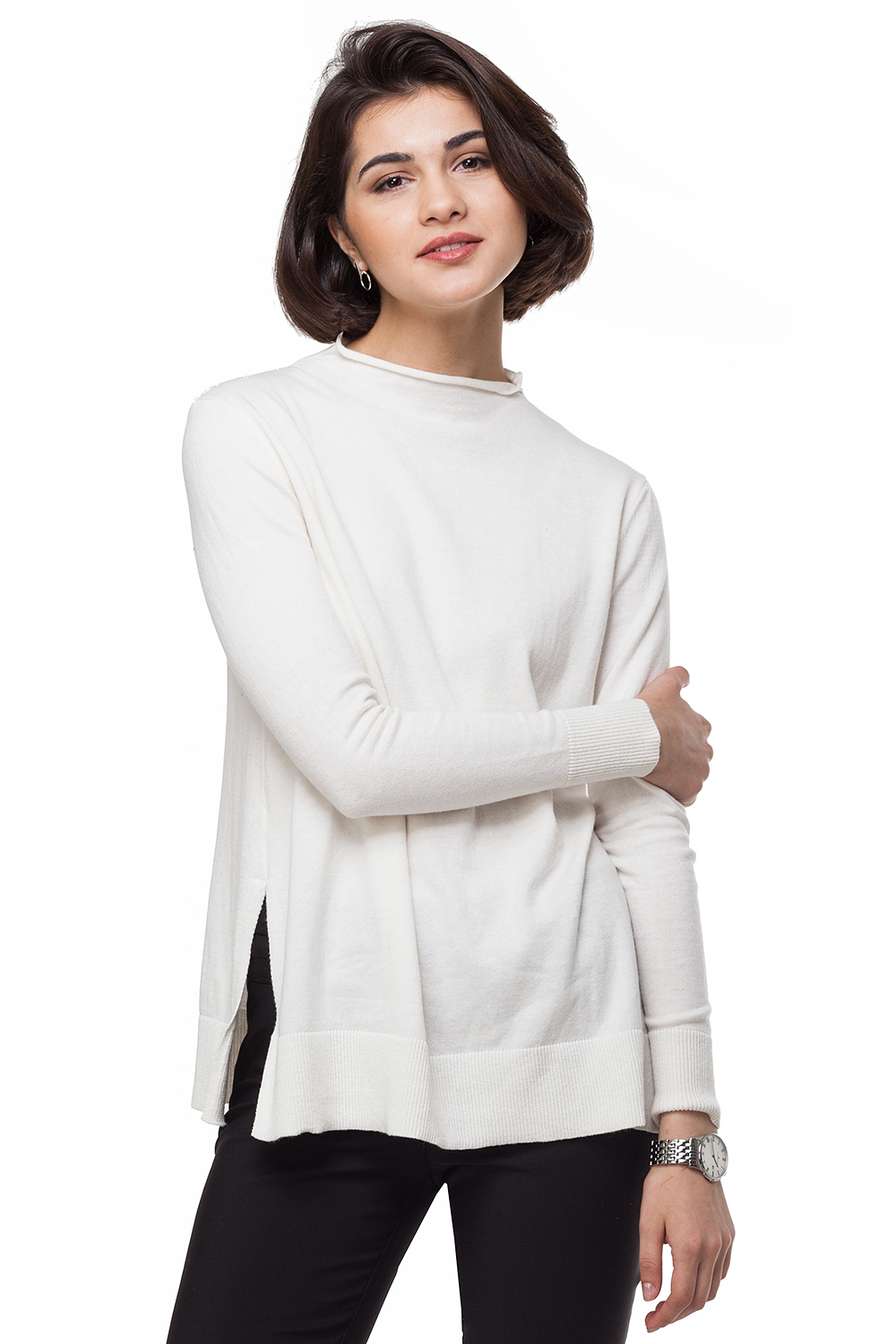 Трикотажный свитер свободной посадки выполнен из хлопковой пряжи с добавлением нейлона для придания формоустойчивости. Изделие прямого кроя с отделкой люрексом и высокими разрезами в боковых швах. Воротник-стойка с необработанным краем.