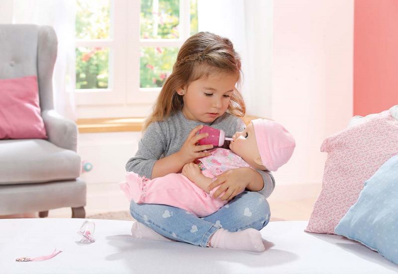 Кукла пьет и сосет соску, двигая ртом. Писает. Она плачет настоящими слезами, срыгивает и лепечет. А если малышку покачать, она уснет.