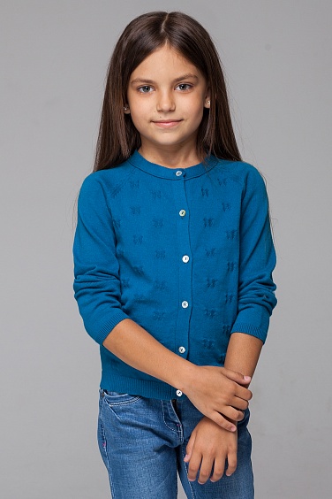 Вязанный жакет из тонкой хлопковой пряжи. Перед ажурной вязки. Застежка на пуговицы из натурального перламутра.