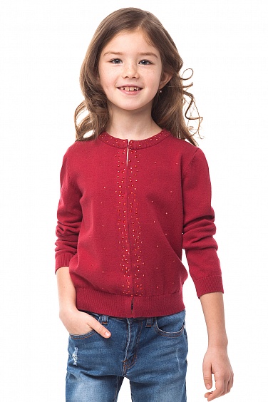 Вязанный жакет из тонкой пряжи с застежкой на крючки. Перед и окантовка горловины украшены декоративными металлическими стразами в тон изделию.