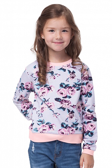 Толстовка для девочки выполнена из принтованого футера. Сзади вырез капля с завязкой на бант. Низ изделия, горловина и манжеты на контрастной резинке.