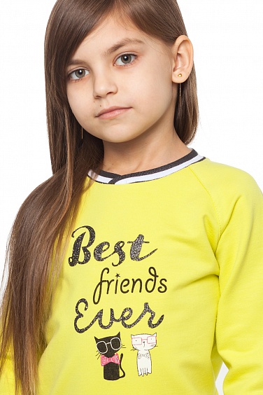 Толстовка для девочки из эластичного футера. Спереди декоративный принт с глиттером. Манжеты, пояс и горловина изделия выполнены из полосатой рибаны.
