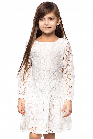 Платье свободного силуэта с широкой оборкой на юбке с заниженной талией. Изделие выполнено из кружевного полотна с цветочным узором на тонкой хлопковой подкладке. Рукав 3/4 собран на манжету с застежкой на пуговицу. Застежка сзади на потайную молнию.