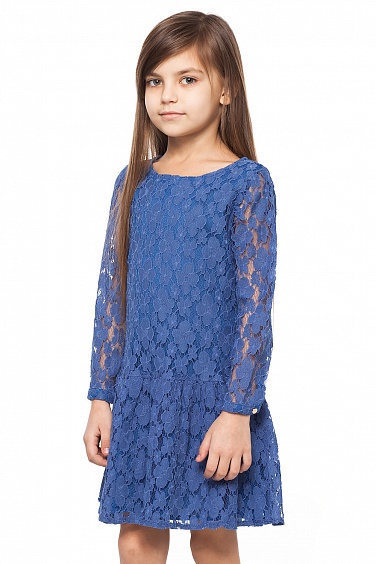 Платье свободного силуэта с широкой оборкой на юбке с заниженной талией. Изделие выполнено из кружевного полотна с цветочным узором на тонкой хлопковой подкладке. Рукав 3/4 собран на манжету с застежкой на пуговицу. Застежка сзади на потайную молнию.