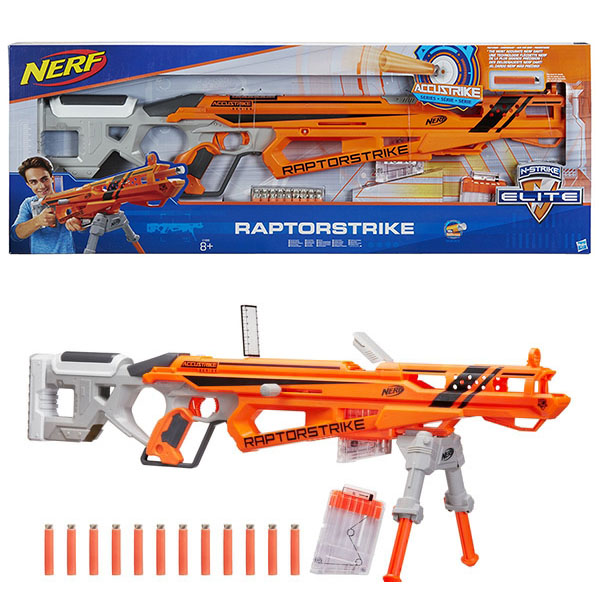 Игрушечное оружие Nerf от Hasbro -- самый желанный подарок любого мальчишки. И бластер Аккустрайк Рапторстрайк - не исключение. Это большое мощное оружие для увлекательных сражений и безоговорочных побед. Бластер выполнен в ярком оранжевом цвете с белыми и серыми элементами. Все в нем продумано до мелочей, создано для максимально быстрой и точной стрельбы. У бластера есть 2 съёмных магазина (1 запасной), удобная рукоять, складной прицел и специальная подставка.
