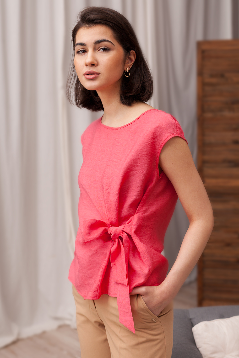 Блуза без рукавов из плотного мягкого полу-вискозного полотна с эффектом жатости. Широкие ленты на поясе завязываются с боку на декоративный бант.