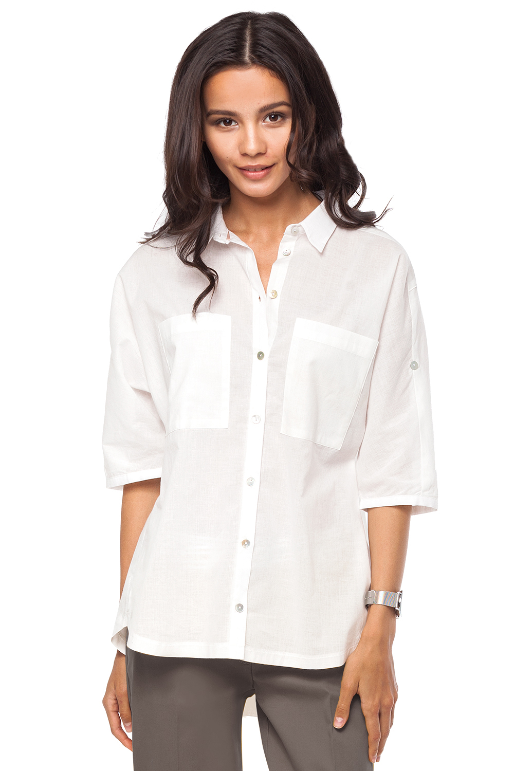 Блузка с укороченным рукавом "летучая мышь" выполнена из тонкой дышащей хлопковой вуали. Модель рубашечного кроя с отложным воротником и большими накладными карманами, удлиненная спинка с фигурной кокеткой. Длина рукава регулируется застежкой на пату. Пуговицы из натурально перламутра.
