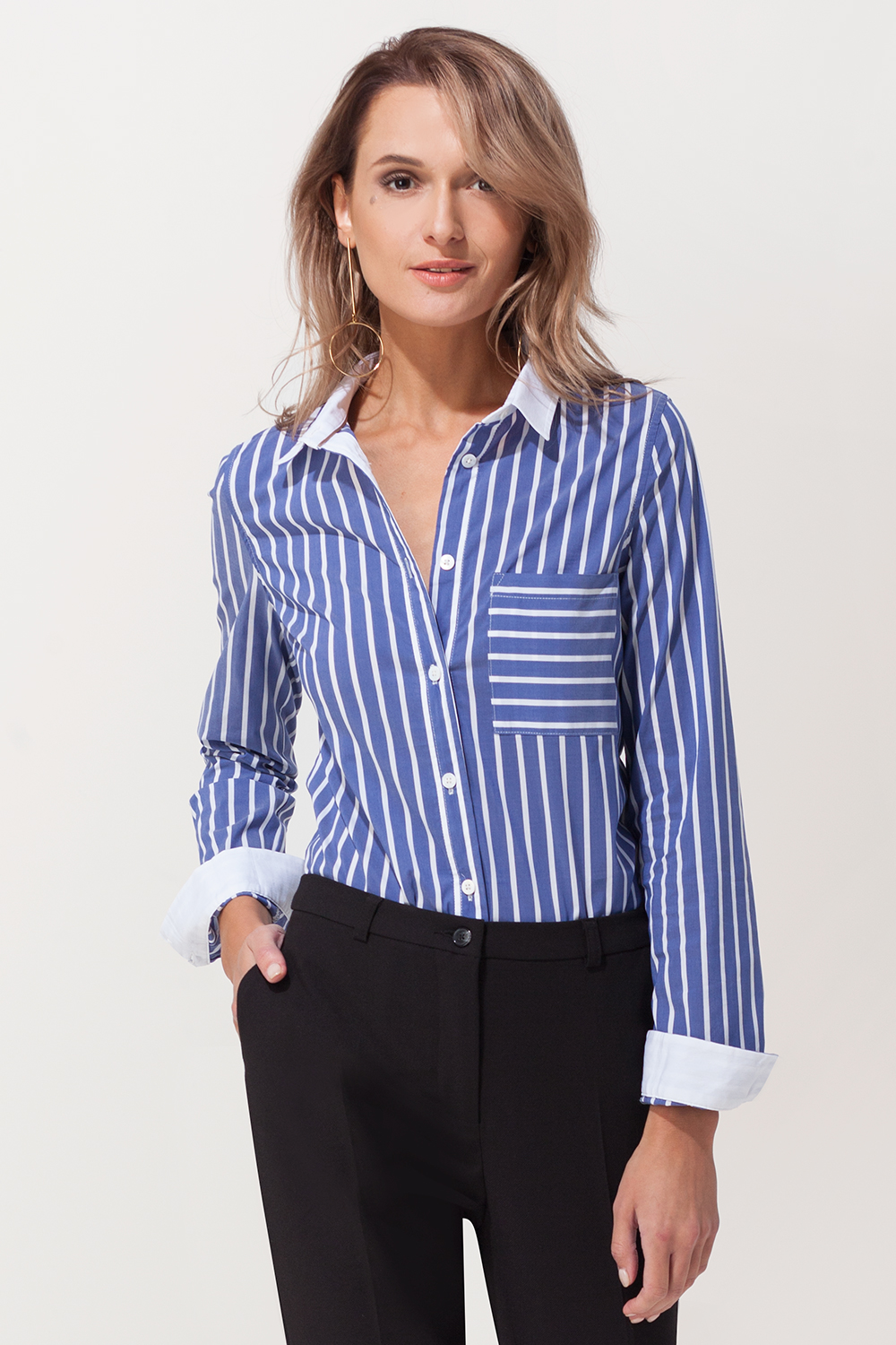 Блузка рубашечного кроя выполнена из тонкого эластичного полотна в широкую вертикальную полоску. Застежка на планку на пуговицах. Изделие дополнено контрастным отложным воротником, на груди накладной карман в горизонтальную полоску.