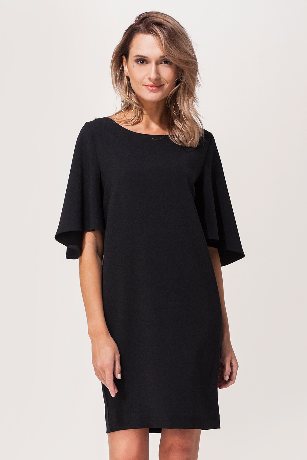 Платье из мягкого пластичного крепового полотна. Прямой силуэт с заужением к низу. Широкие клешеные рукава с драпировкой.