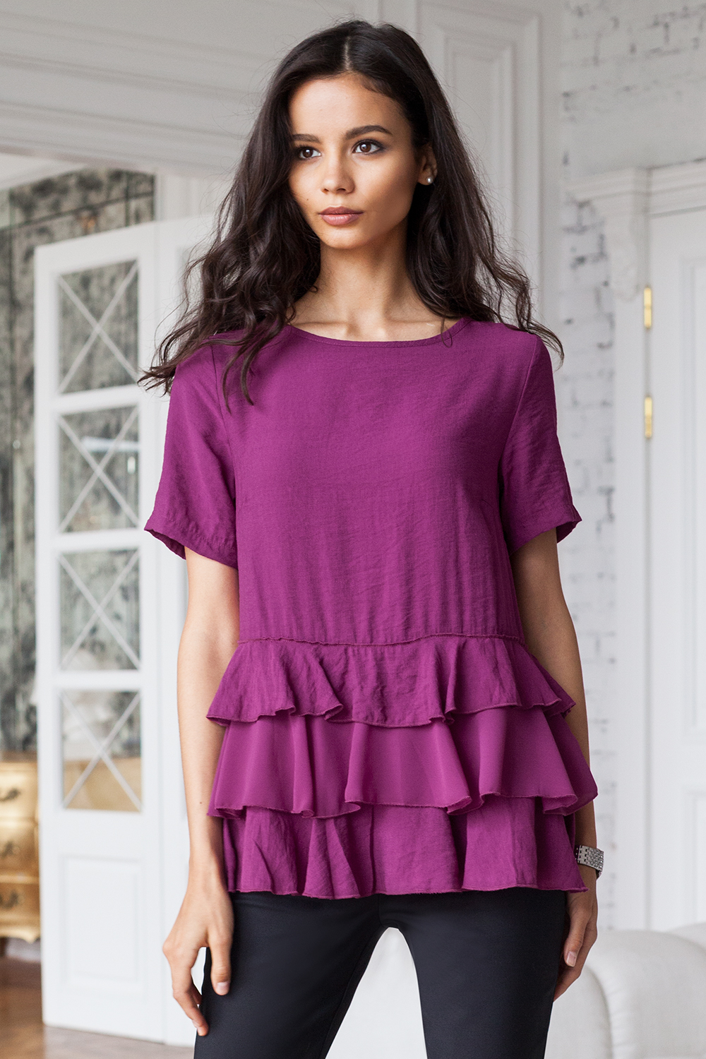 Блузка свободного силуэта выполнена из плотного вискозного полотна с легким эффектом жатки. Баска дополнена рядами воланов, которые придают изделию эффектный и женственный вид.