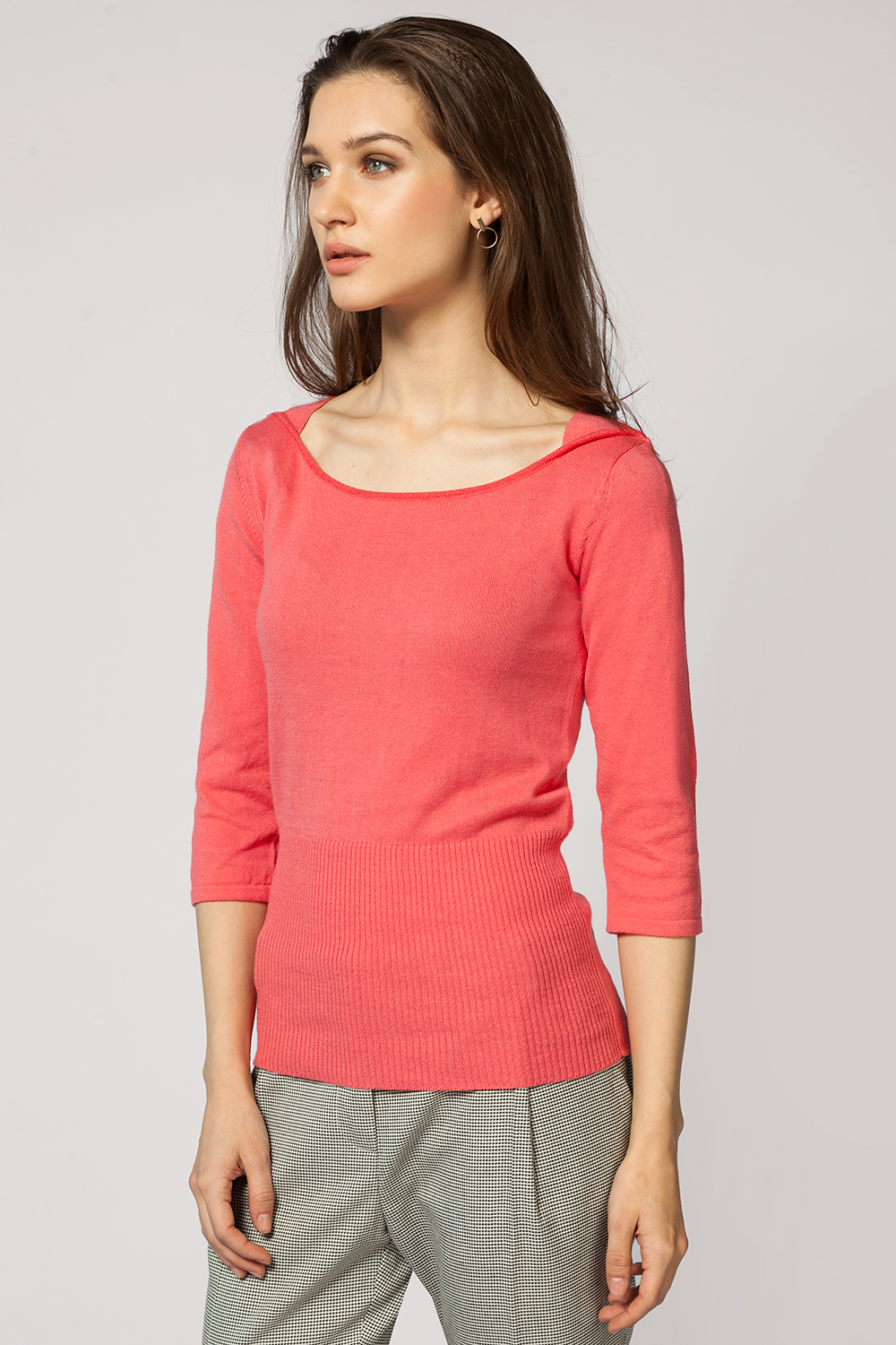 Джемпер с рукавами 3/4 выполнен из мягкого вязаного трикотажа. Низ изделия вязан широкой резинкой с плотным прилеганием по фигуре, эффектный вырез-лодочкой выполнен фактурной вязкой с добавлением люрексной нити.