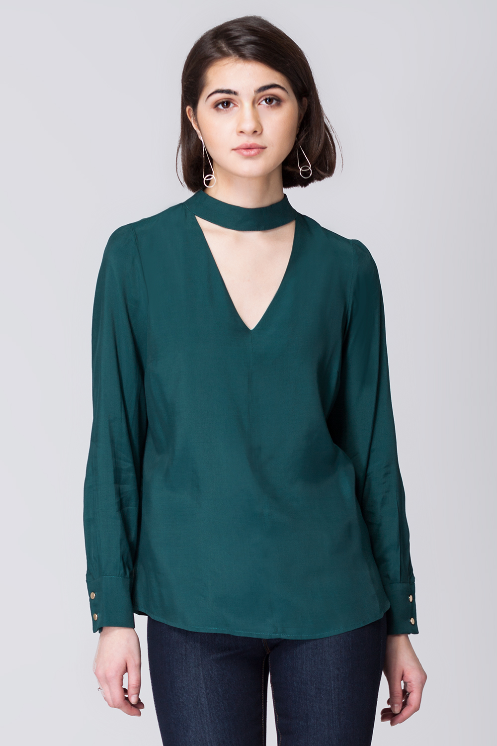 Блузка с трендовым сочетанием глубокого V-образного выреза и воротника-стойки. Изделие свободного силуэта выполнено из штапельного вискозного полотна. Сзади воротник застегивается на пуговицы.