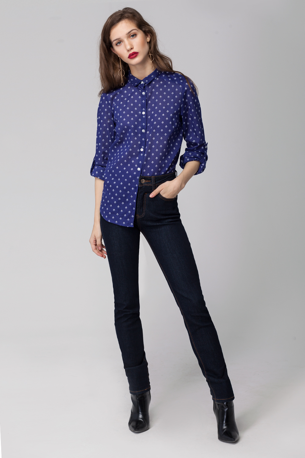 Хлопковая рубашка классического кроя выполнена из фактурного полотна с узором. Застежка на планку на пуговицах, длина рукава регулируется застежкой на пату.