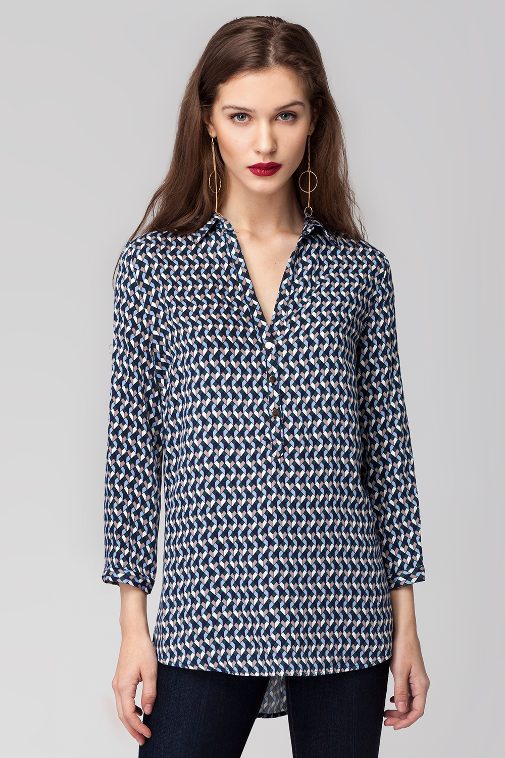 Блузка свободного кроя выполнена из штапельного вискозного полотна с геометрическим узором. Модель с удлиненной спинкой и рукавом 3/4. Глубокий V-образный вырез дополнен застежкой на планку на пуговицах.