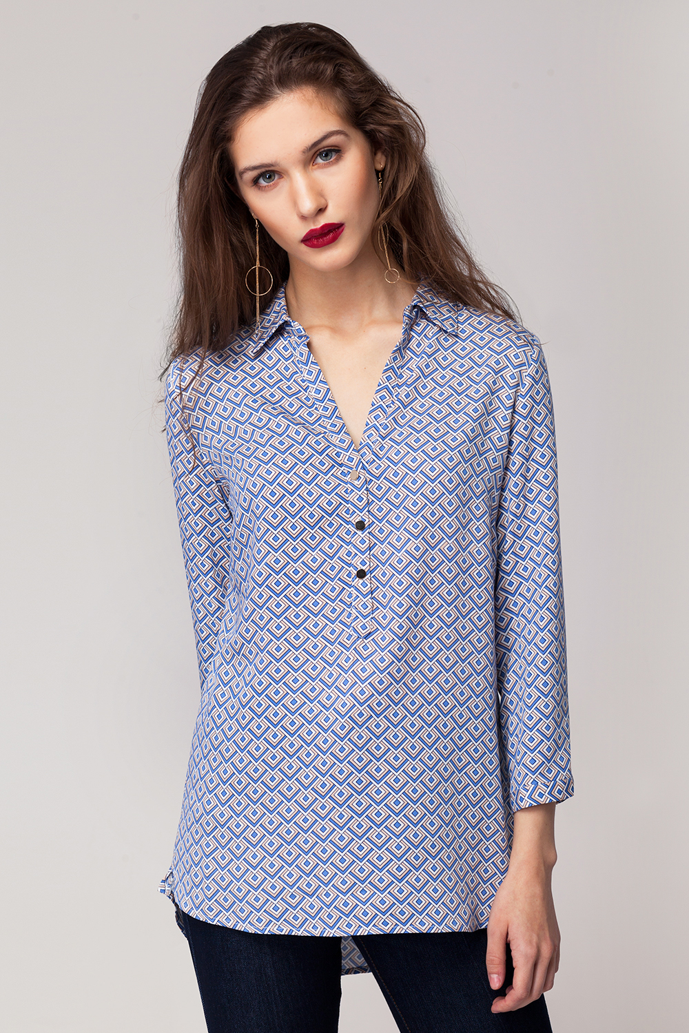 Блузка свободного кроя выполнена из штапельного вискозного полотна с геометрическим узором. Модель с удлиненной спинкой и рукавом 3/4. Глубокий V-образный вырез дополнен застежкой на планку на пуговицах.