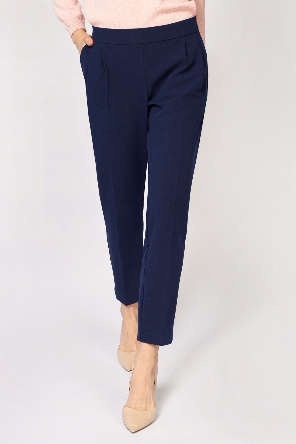 Брюки выполнены из эластичной поливискозной ткани с застежка на потайную молнию в боковом шве. Свободный силуэт с укороченными брючинами дополнен классическими наклонными карманами.
