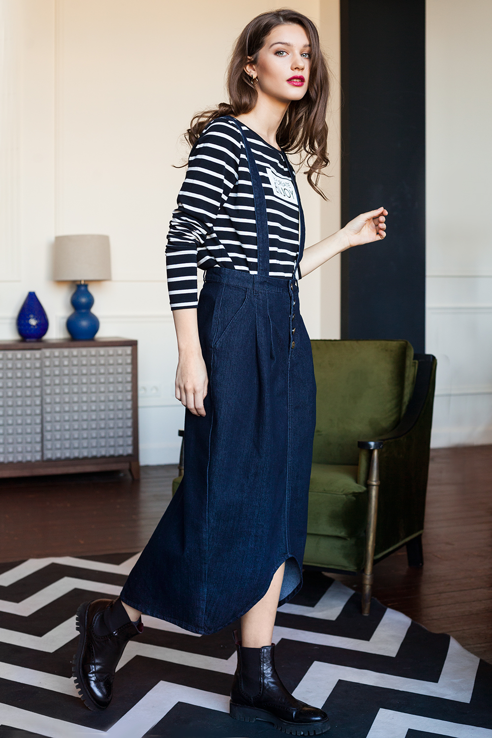 Юбка-балон на лямках выполнена из эластичного денима. Сложный крой с асимметричным низом и высоким разрезом на спинке. Спереди застежка на пуговицы, карманы в боковых швах.