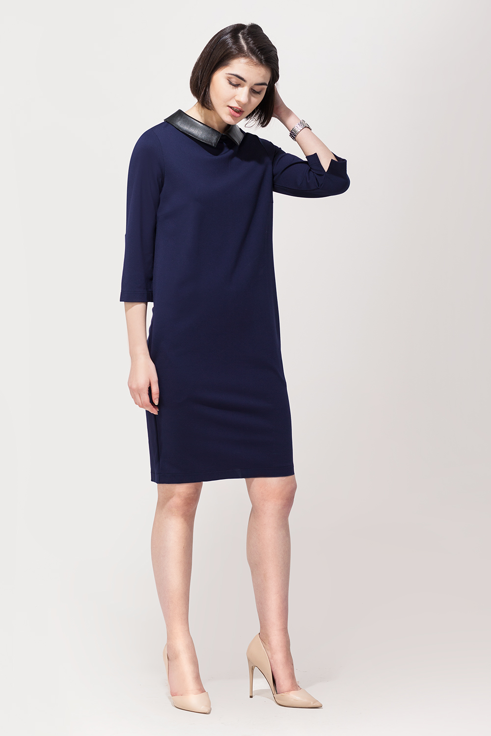 Платье полуприлегающего силуэта выполнено из мягкого эластичного трикотажа. Изделие дополнено эффектным съемным воротником из иск. кожи. Карманы в боковых швах.