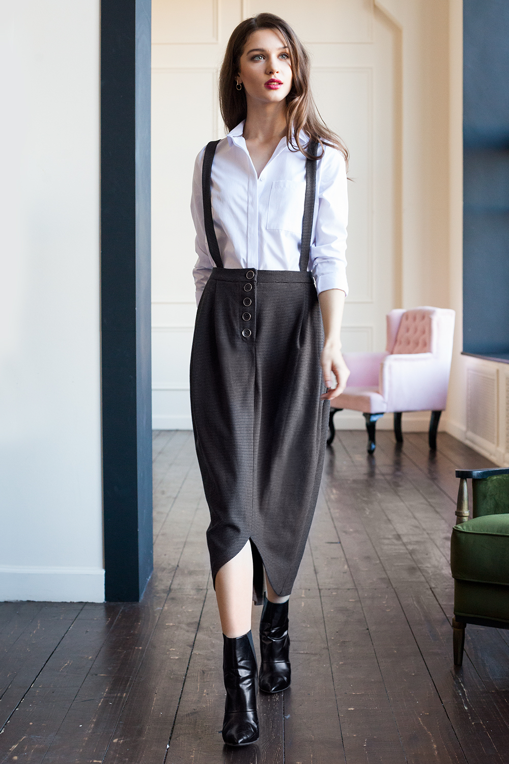 Юбка-балон на лямках выполнена из мягкой костюмной ткани в трехцветный узор "гусиная лапка". Сложный крой с асимметричным низом и высоким разрезом на спинке. Спереди застежка на пуговицы, карманы в боковых швах.