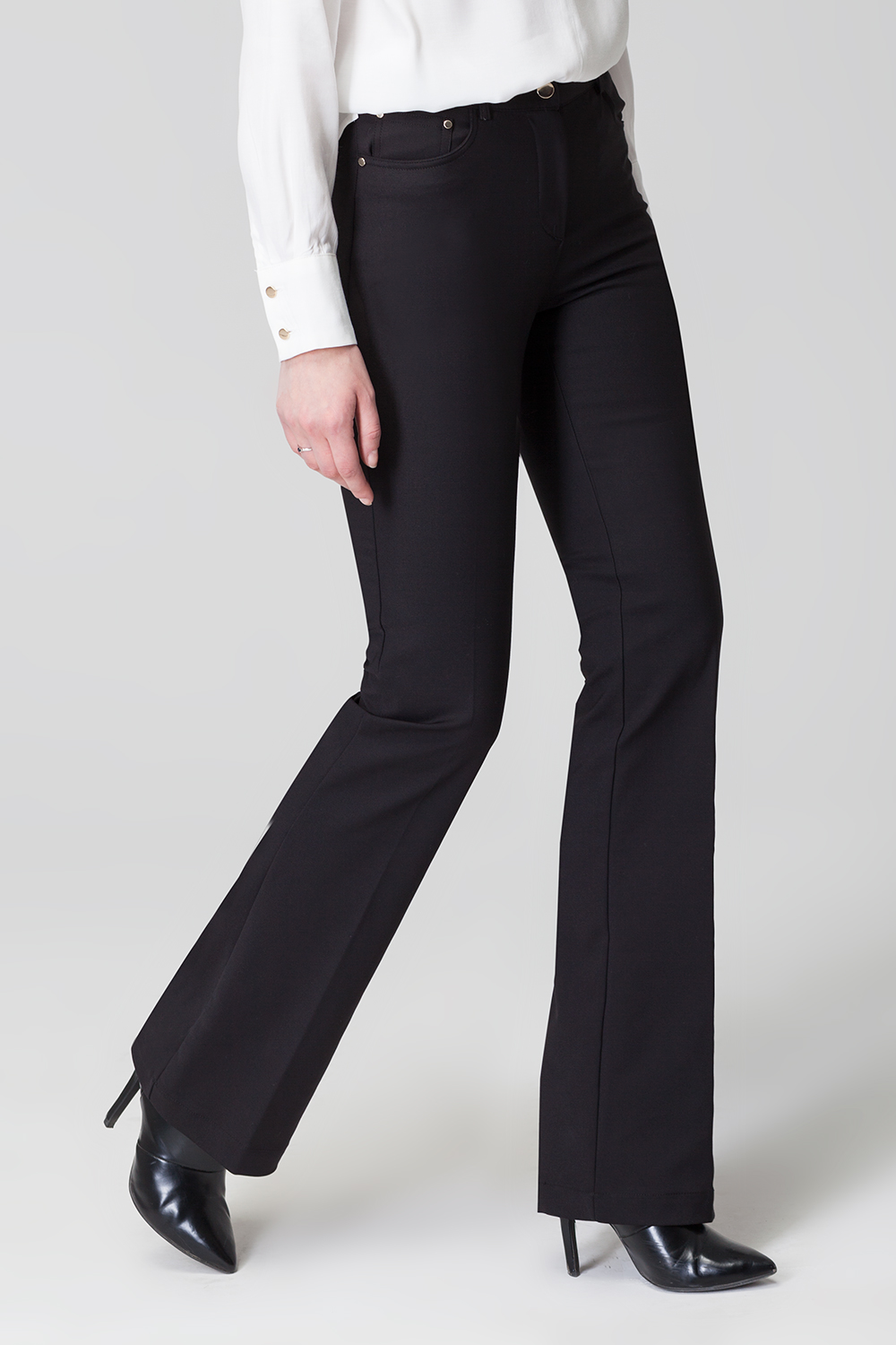 Расклешенные брюки - классика стиля 70-х. Плотная посадка по бедрам, заутюженные стрелки и покрой с 5 карманами. Такая модель станет отличным дополнением делового образа.