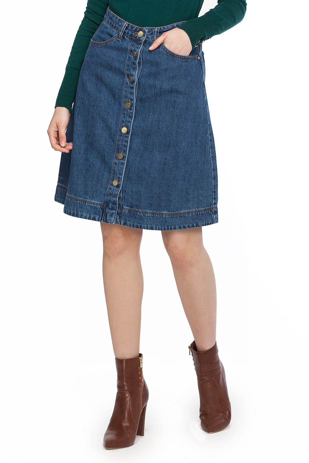 Юбка-трапеция изготовлена из плотного мягкого денима. Покрой с четырьмя карманами, застежка на планку на пуговицах. За счет своего лаконичного дизайна изделие станет прекрасной основой для создания повседневных образов.