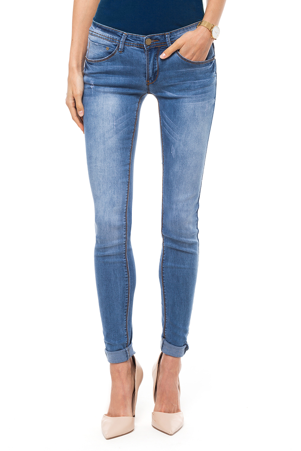 Джинсы-скинни на заниженной талии выполнены из эластичного светлого денима. Изделие с эффектом стирки и потертостями декорировано контрастными строчками. Джинсы скинни обязательная базовая вещь в повседневном гардеробе.