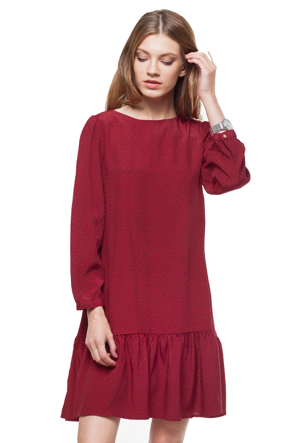 Платье свободного кроя с укороченным рукавом выполнено из штапельного вискозного полотна с принтом. Модель украшена широким воланом по низу. Сзади застежка на потайную молнию.