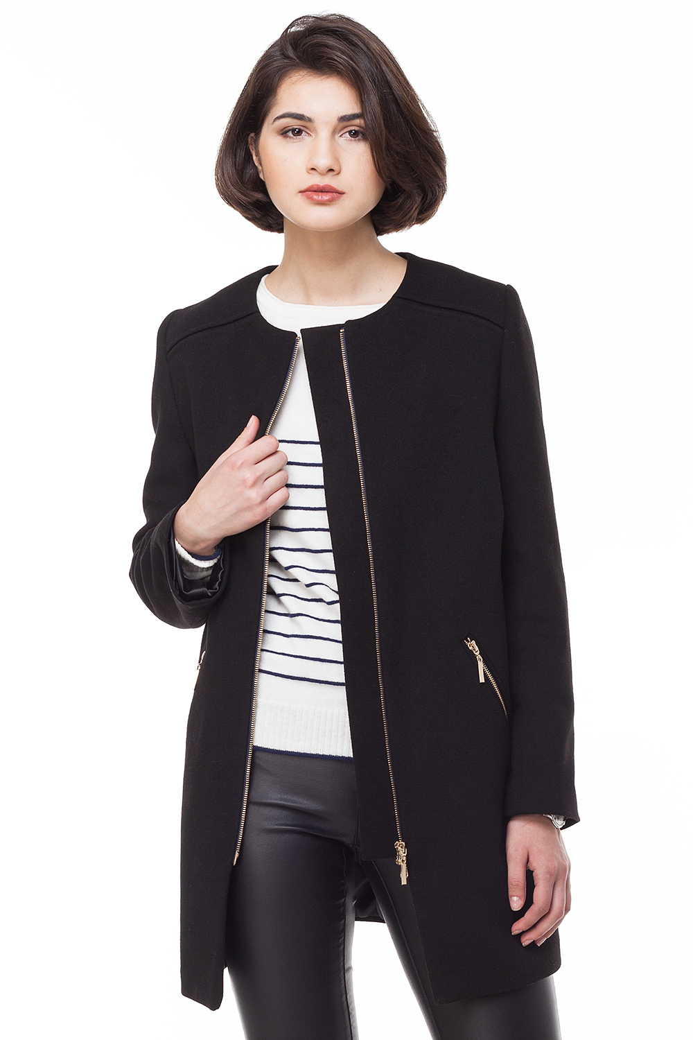 Пальто прямого кроя с округлым вырезом горловины и застежкой на золотистую молнию. Изделие на плотной поливискозной подкладке, спереди наклонные карманы. Модель дополнена декоративными швами с контрастными вставками.
