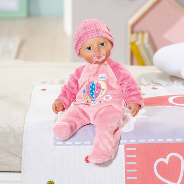 Очаровательный пупс от компании Zapf Creation - отличный подарок для девочки. Эта куколка отличается от классических интерактивных кукол Бэби Борн - тельце куклы мягконабивное, из твердых материалов изготовлены только голова и конечности. Куколку можно брать с собой в кроватку, она не очень тяжелая и подойдет даже маленьким детям.