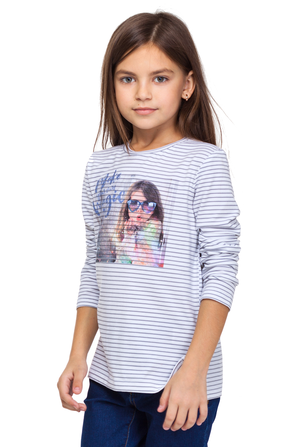 Футболка с длинным рукавом выполнена из мягкого трикотажа. Спереди изделие декорировано принтом с глиттером.
