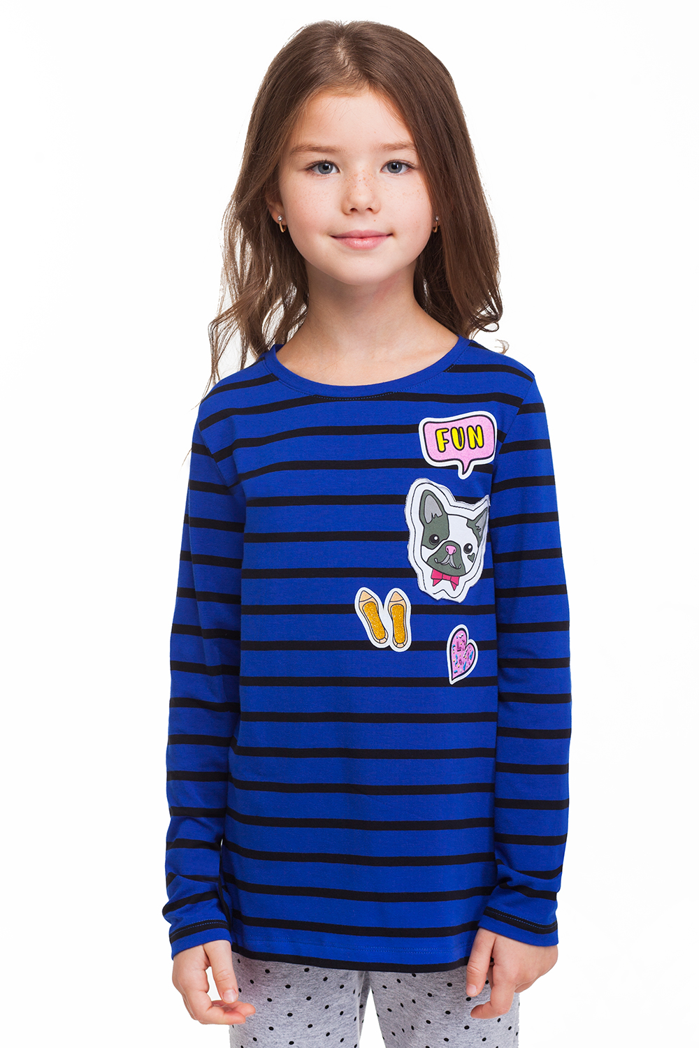 Тельняшка с длинным рукавом выполнена из мягкого трикотажа. Изделие декорировано принтом с глиттером и нашивками.