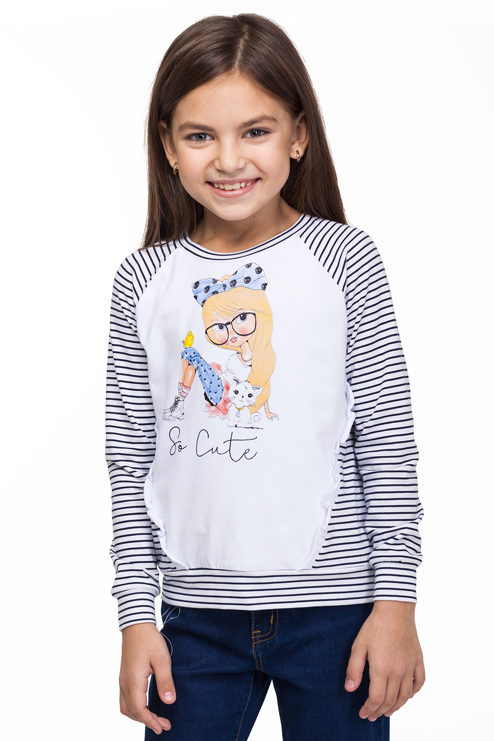 Футболка с длинным рукавом выполнена из эластичного хлопкового полотна. Смещенные боковые швы дополнены оборками, спереди декоративный принт.