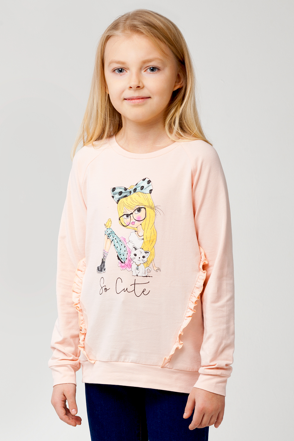 Футболка с длинным рукавом выполнена из эластичного хлопкового полотна. Смещенные боковые швы дополнены оборками, спереди декоративный принт.