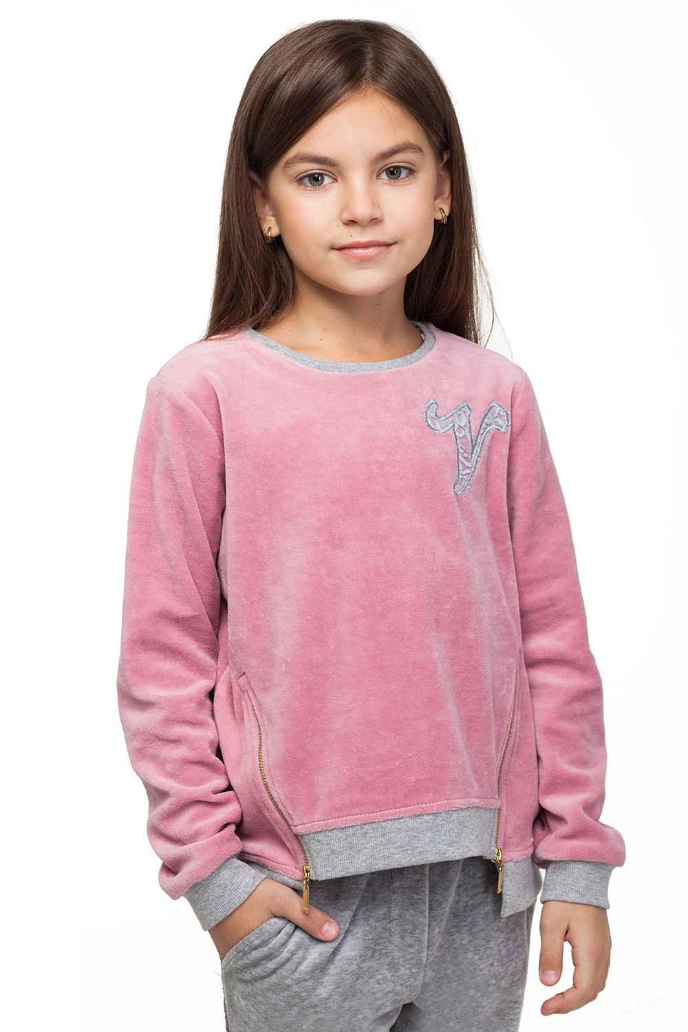 Толстовка свободного кроя выполнена из мягкого эластичного велюра. Изделие с контрастными деталями из рибаны и декоративными застежками на молнии. Спереди кружевная нашивка с лого. Рекомендуем приобретать в комплекте с брюками F44.057 для создания стильного спортивного образа.