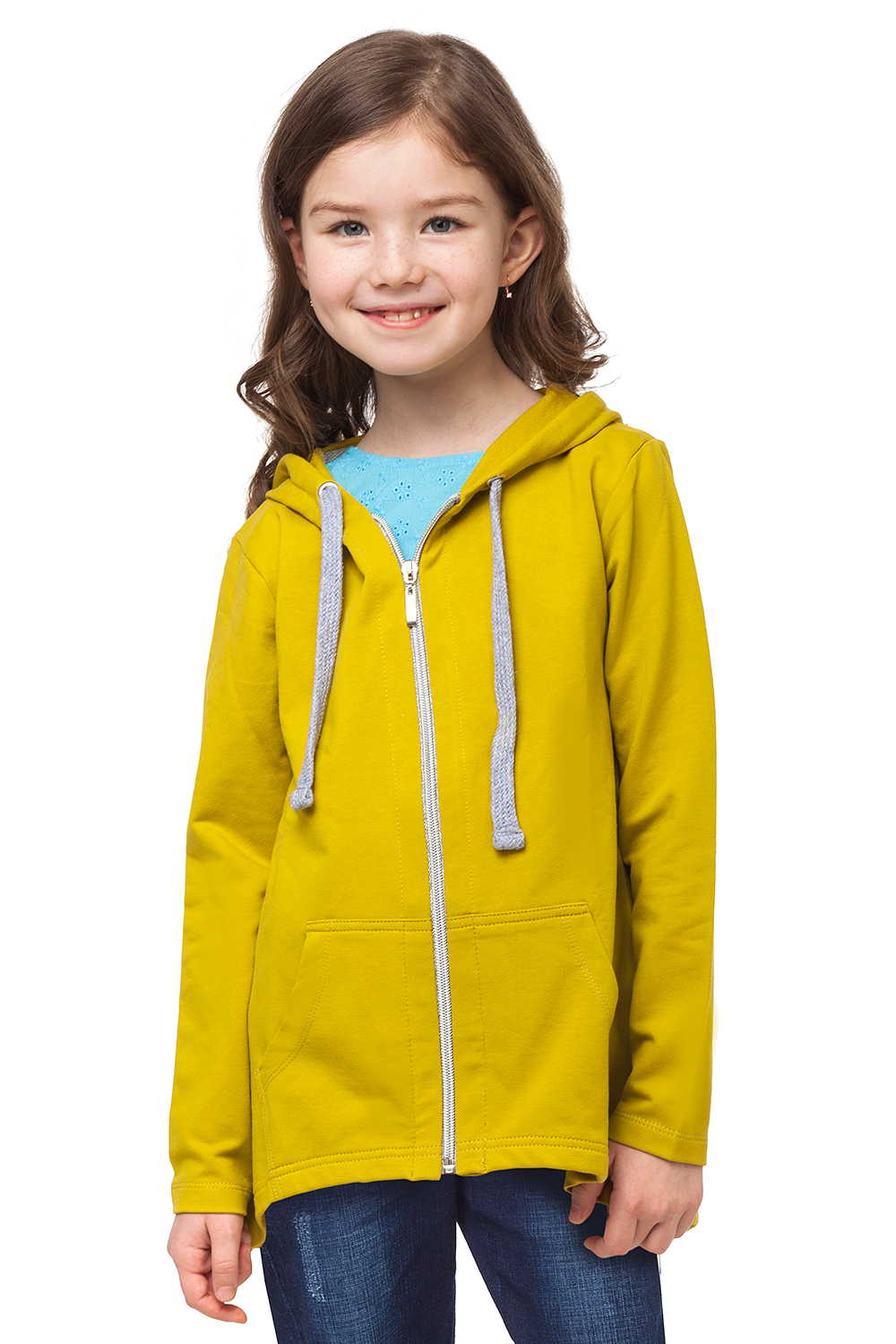 Однотонная толстовка на молнии с капюшоном выполнена из эластичного двухниточного футера. Оригинальный свободный силуэт изделия с удлиненной спинкой. Спереди накладные карманы. По краю капюшона и по низу изделия сзади - хлопковая тесьма, позволяющая регулировать объем.