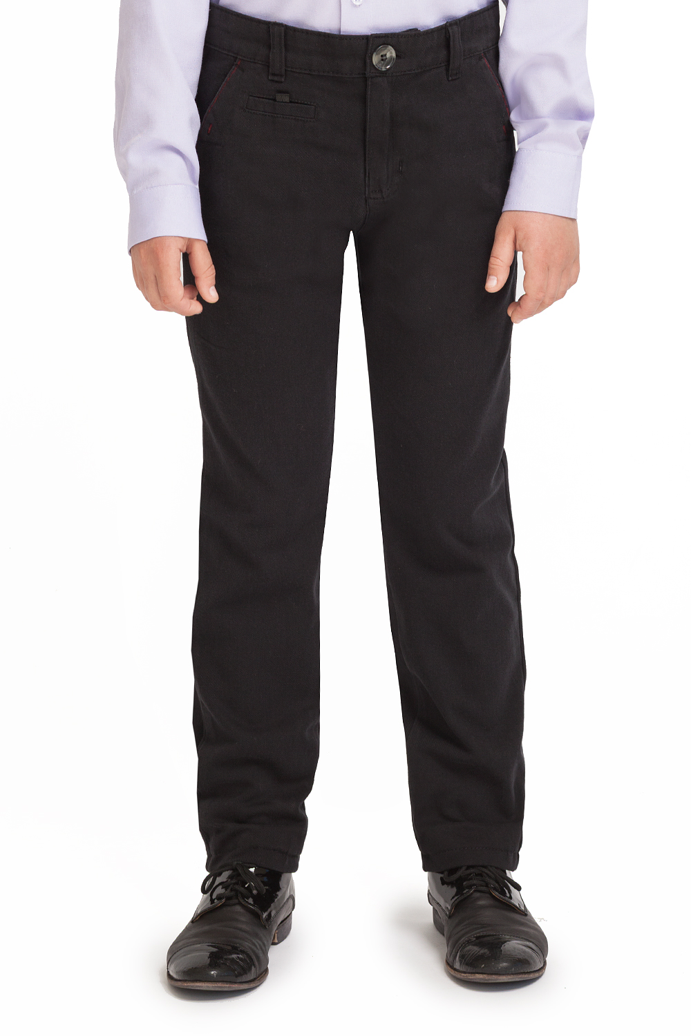 Брюки для мальчика выполнены из плотной хлопковой ткани. Декоративные отстрочки выполнены контрастными нитками. Спереди наклонные карманы, сзади карманы в рамку.
