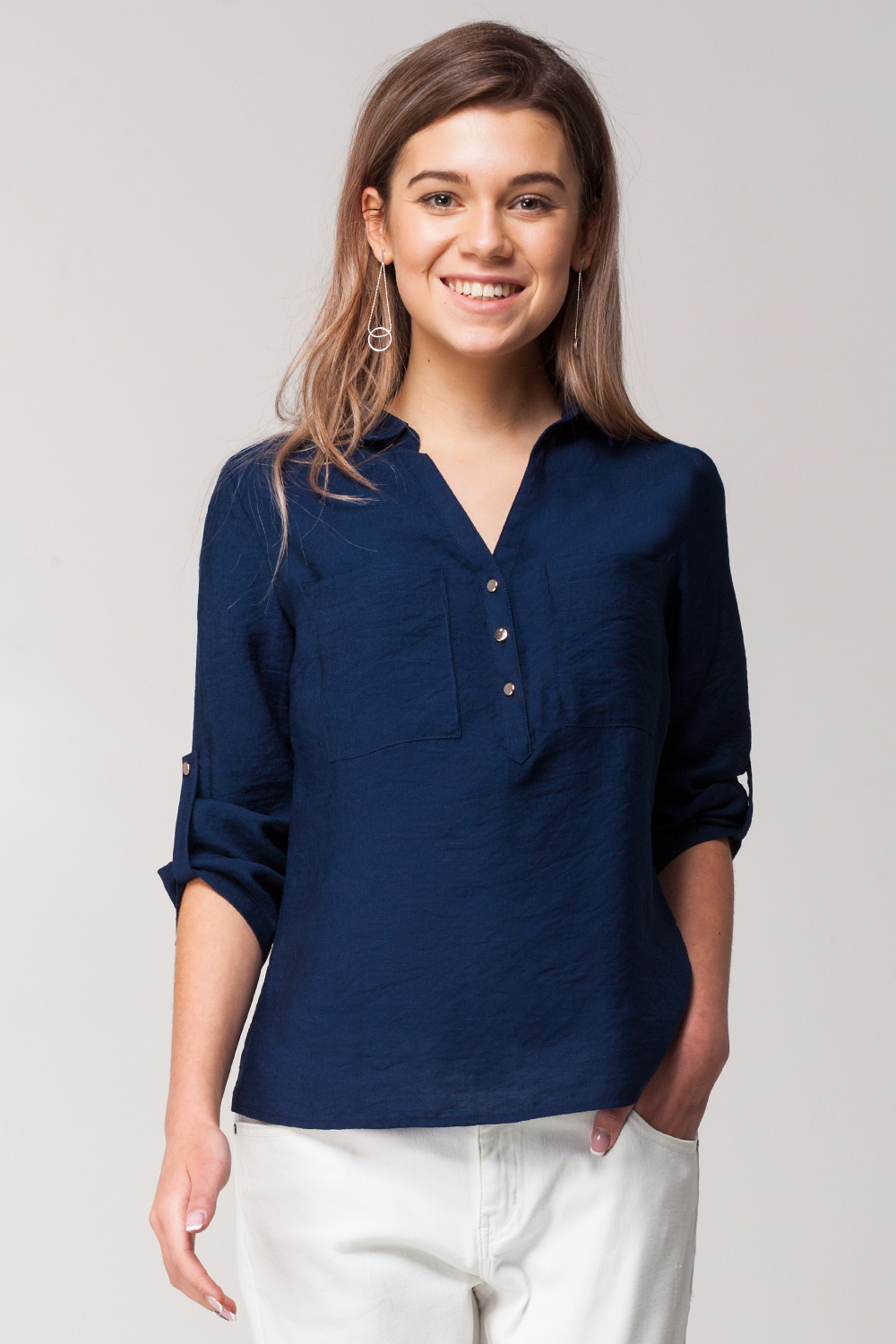 Блуза прямого силуэта с удлиненной спинкой выполнена из поливискозного полотна с эффектом жатости. Отложной воротник с V-образным вырезом и планка с застежкой на пуговицы. Спереди накладные карманы. Втачной рукав 3/4, длина регулируется патой с застежкой на пуговицу.